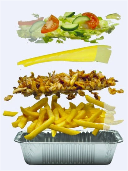 Friet of Rijst, kipfilet, gesmolten kaas, salade, saus naar keuze (standaard met chili en knoflook)0